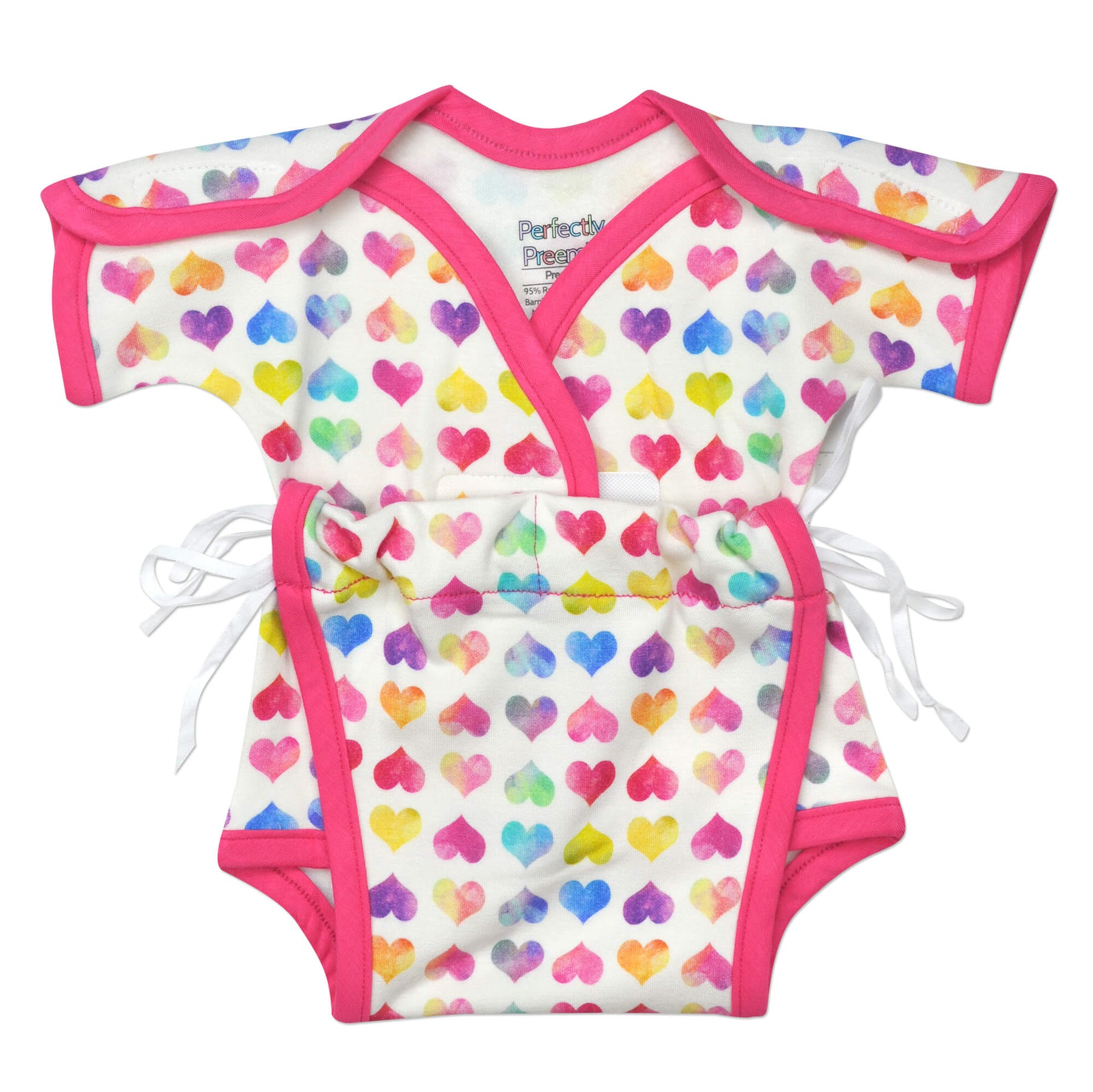 The Sweet-tee bodysuit is the longest running style Perfectly Preemie has made. A few years ago they added the open-shoulders for easier access in the NICU. The quick and easy velcro closures make dressing a snap. The tie closures provide growing room for growing preemies.