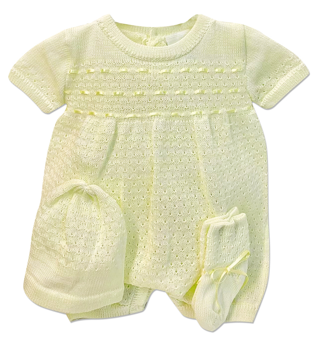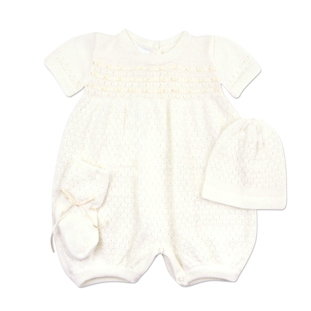 This absolutely precious new arrival from boutique designer Will'beth is perfect for your new preemie baby. Made from fine poly-cotton, this 3pc romper set is perfect for that special outing or going home.